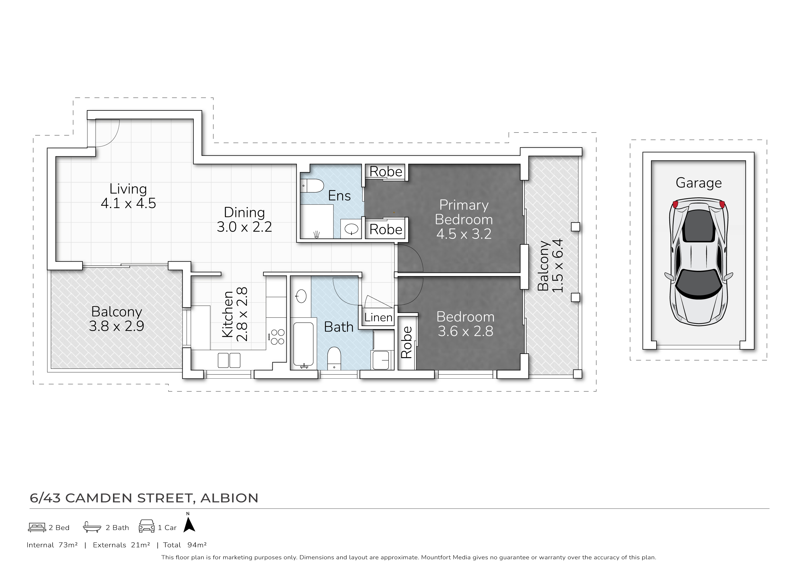 -Two balconies: one off the living area and one at the rear connecting both bedrooms