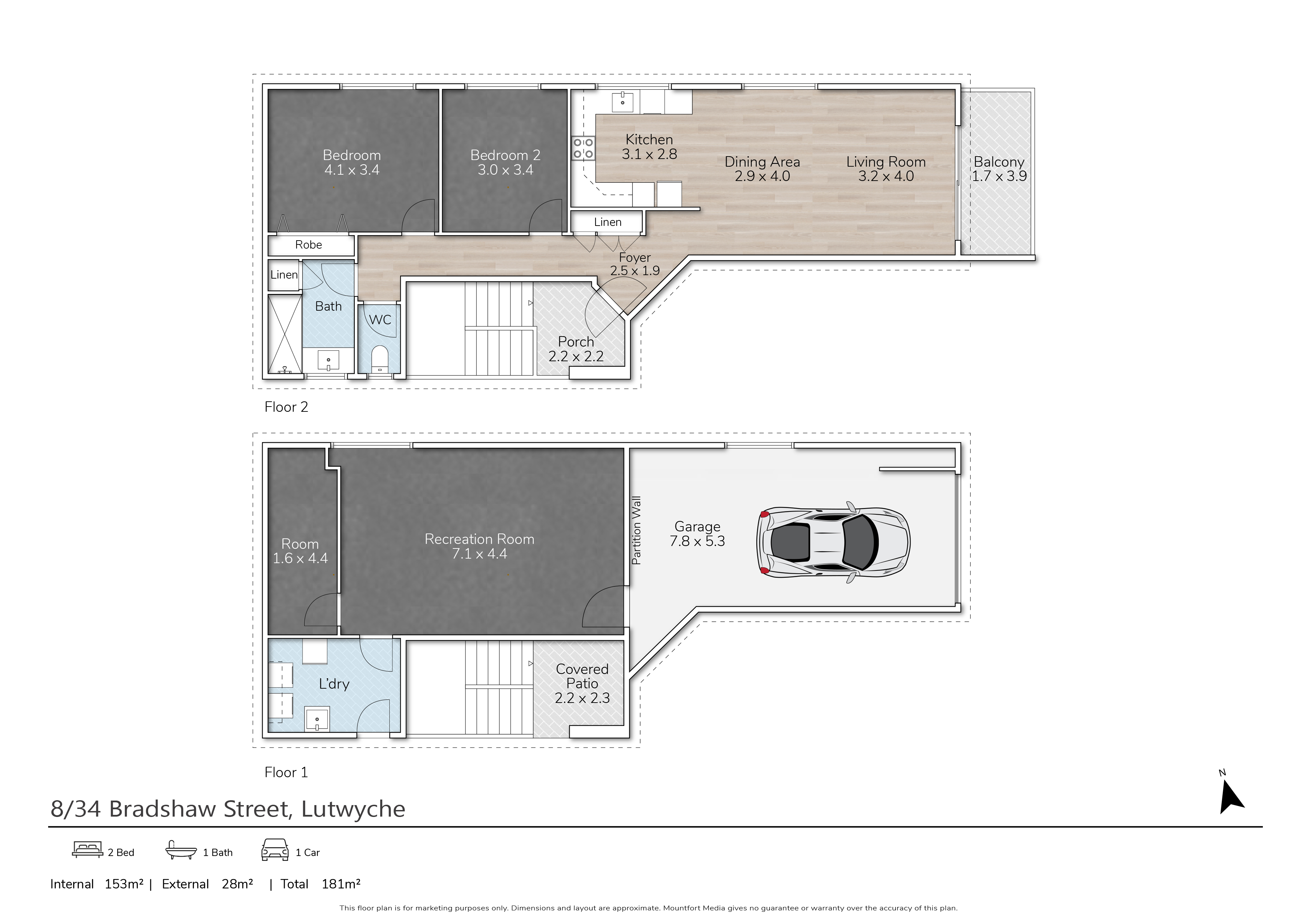 -Master bedroom with built-in robe, both bedrooms separated from living areas for privacy